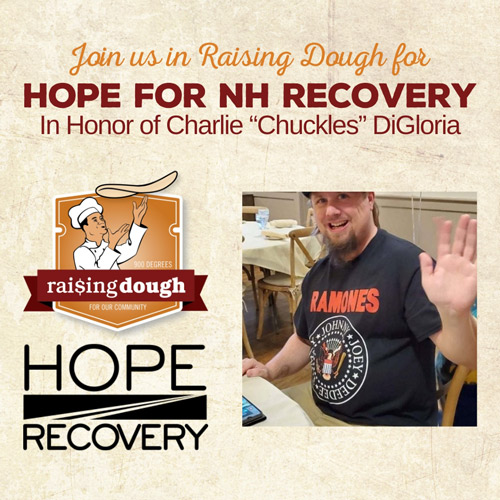 Would you like to honor Charlie and support Hope for New Hampshire Recovery? Please join us at 900 Degrees on October 30th after 5:00pm. Be sure to mention to your server that you are dining to support this Raising Dough fundraiser, and a portion of sales will be directly donated to Hope for NH Recovery. This applies to dine-in customers only.