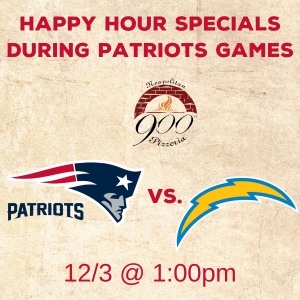 Are you looking for a great bar to watch the Patriots game in Manchester, NH? Look no further than 900 Degrees! During the 2023 season, 900 Degrees Neapolitan is offering our Happy Hour specials, typically reserved for Monday thru Friday, during every Patriots game. So, come watch the Patriots game at our bar and enjoy $4.50 select draft beers and $5.95 house wine, as well as some delicious Happy Hour food specials.